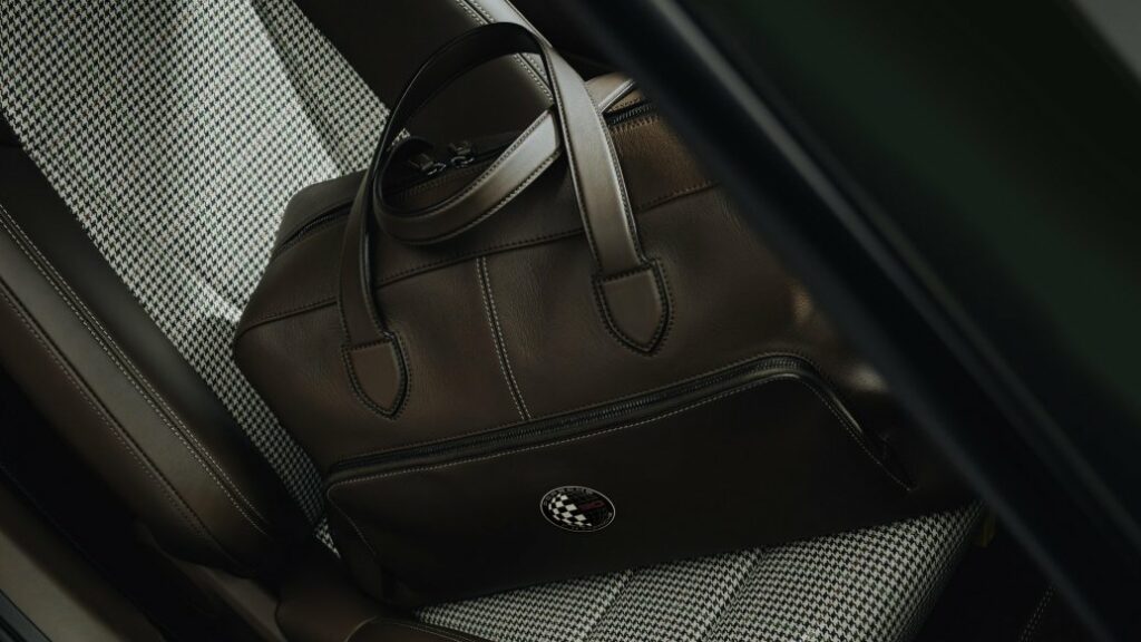 La doublure de la poche avant du sac de voyage est en tissu F. A. Grid-Weave, utilisé pour les sièges, tandis que le compartiment principal est doublé de microfibre de haute qualité. Le badge avec le logo anniversaire, assorti au badge de la calandre sur le couvercle du coffre du véhicule, est également brodé sur la poche extérieure du sac.