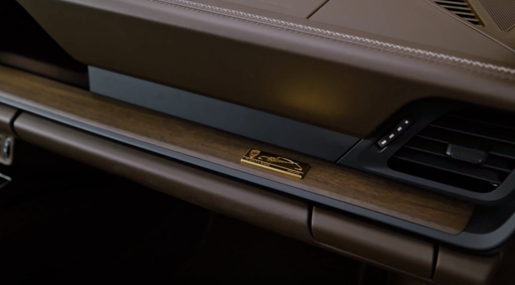 Autre élément remarquable à l’intérieur de la voiture : le pommeau du levier de vitesses en contreplaqué de noyer, sur lequel est gravée la signature de F. A. Porsche. Un autre badge en Or avec une reproduction de la signature, la silhouette originale de la 911 et les mots « One of 90 » sur la baguette décorative du tableau de bord identifient chaque 911 GT3 90 F. A. Porsche comme un objet de collection limité d’une valeur rare. De plus, l’accoudoir de la console centrale est estampillé du même motif que le badge extérieur.