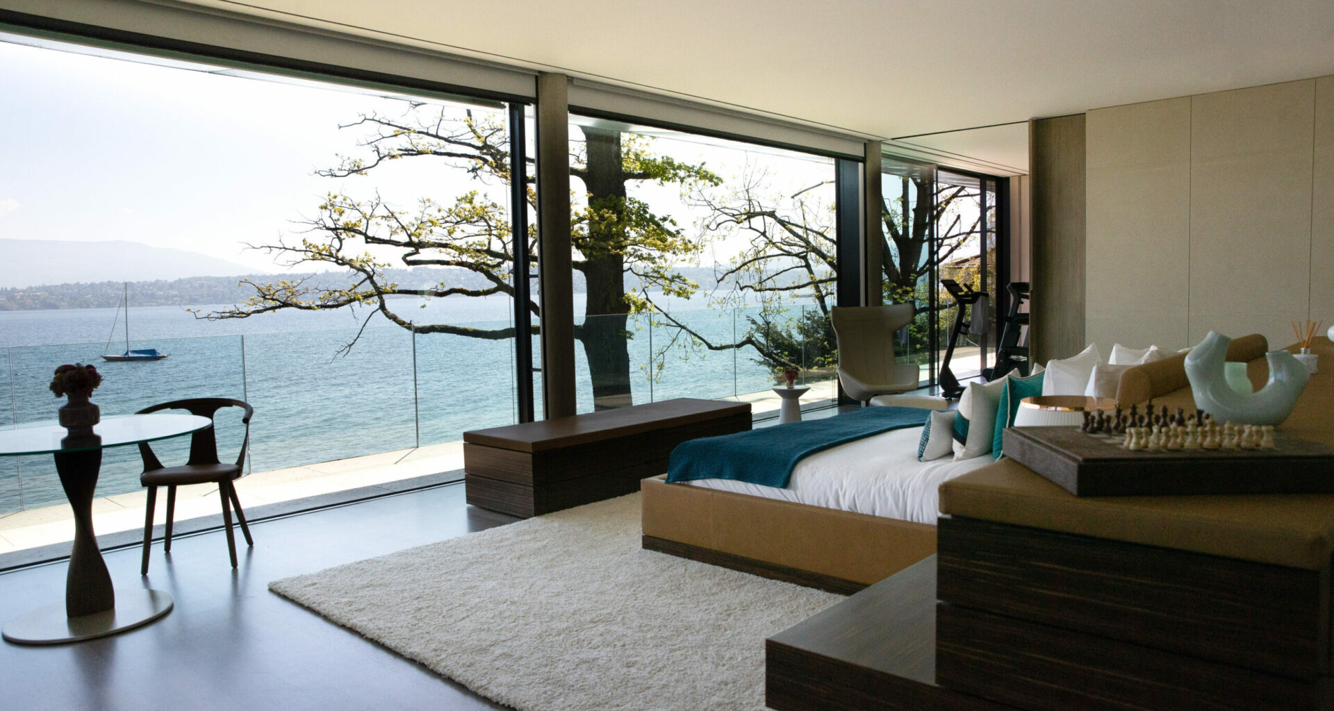 La Villa du Lac déploie ses généreux volumes sur 385 m2 de salons et salle à manger panoramiques ainsi que ses chambres spacieuses. Prolongée d’un jardin bordé par les reflets du Léman, elle profite des services signatures de La Réserve Genève.