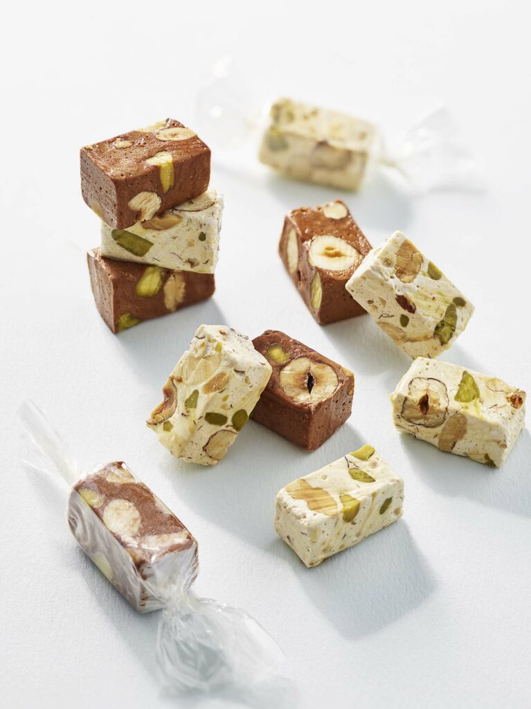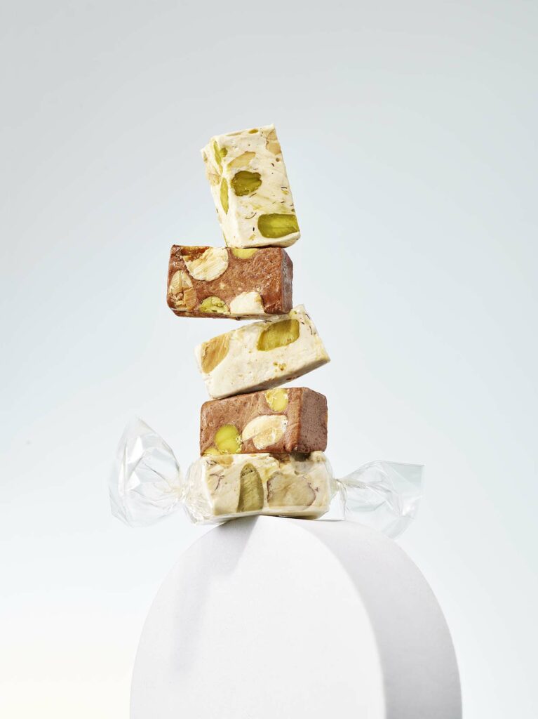 Nougats classique ou chocolat révèlent la pureté du miel et le croquant des amandes Valancia d’Espagne, noisettes Romaines d’Italie et pistache dans une texture fondante.