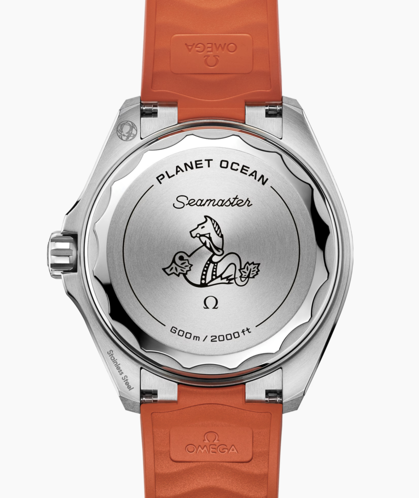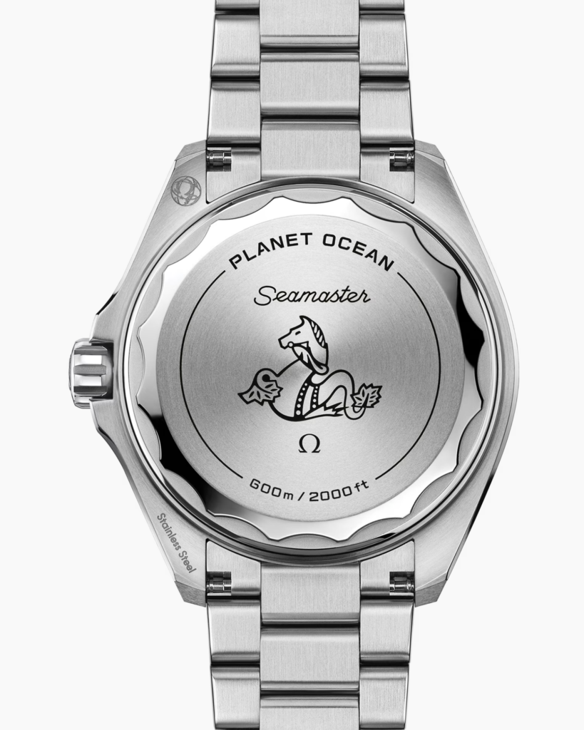Au lieu d’un fond transparent en verre saphir, les nouvelles Planet Ocean disposent désormais de fonds vissés en titane grade 5. Cela a contribué à affiner les dimensions de la montre, tout en réduisant le poids et en augmentant la robustesse. Le design du fond présente un bord ondulé, avec les gravures PLANET OCEAN et SEAMASTER, une indication de l’étanchéité, ainsi que l’emblème iconique de l’hippocampe OMEGA gravé au centre.