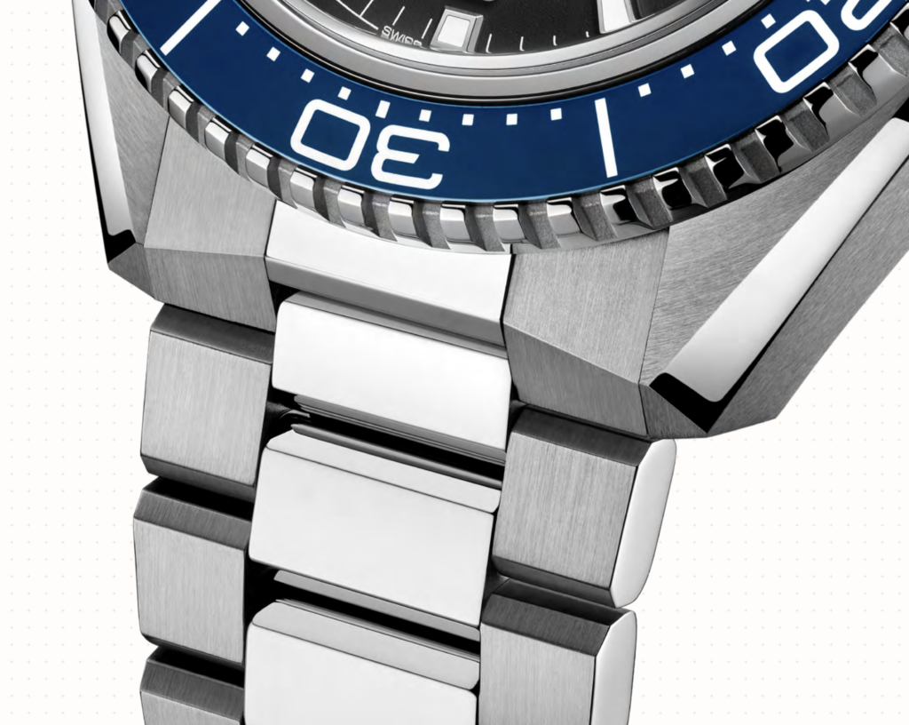 Inspirée par les anciennes montres Seamaster, la nouvelle structure de boîtier de la Planet Ocean dévoile des lignes plus anguleuses et des arêtes plus nettes.