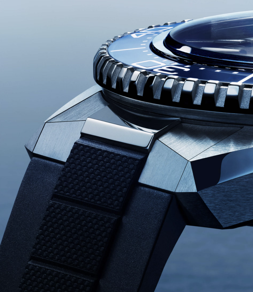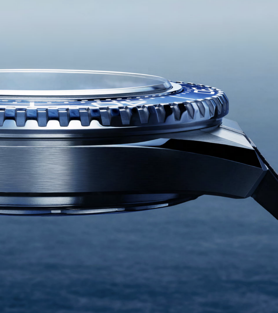 L’architecture de la Planet Ocean 4e génération dévoile une carrure à la structure spectaculaire. Composée de deux parties – le corps principal et une bague intérieure en titane – elle révèle des lignes plus nettes et des angles mieux définis. Pour mieux s’adapter à cette nouvelle esthétique, OMEGA a également retiré la valve à hélium, élément clé de la collection depuis 20 ans.