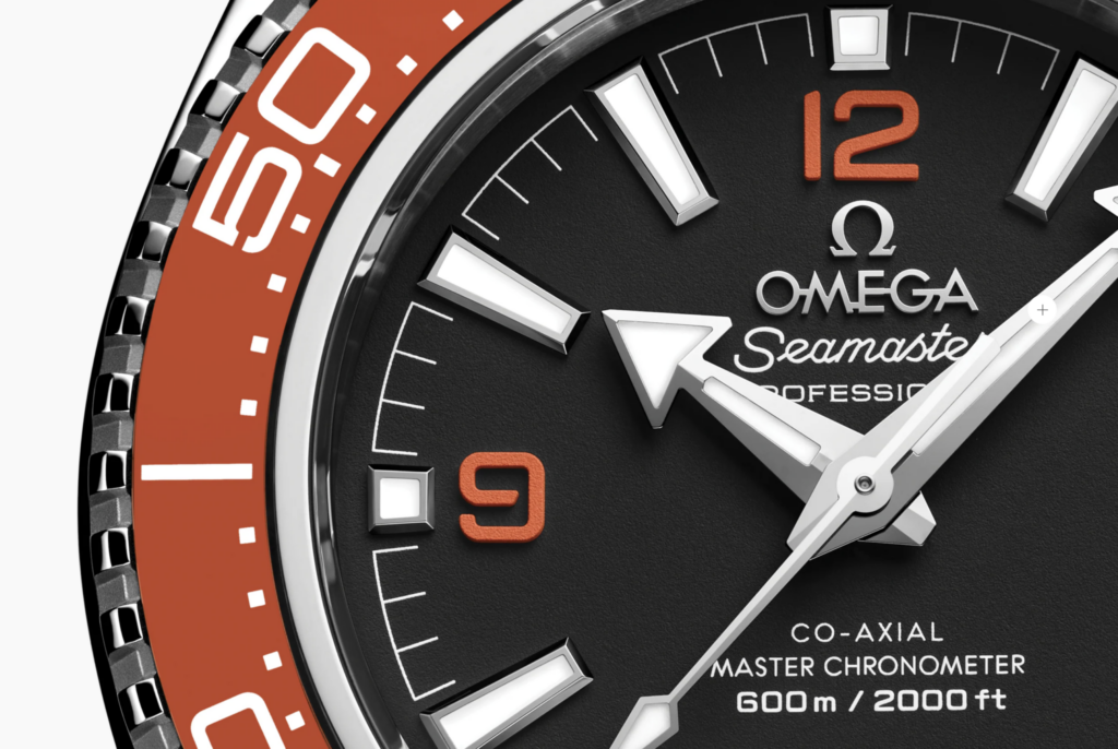 Chaque cadran de la nouvelle collection Planet Ocean est noir mat. OMEGA a conservé les aiguilles flèche et les index appliqués audacieux remplis de Super-LumiNova, mais une différence nouvelle est la typographie des chiffres arabes. Bien que subtile, les chiffres sont désormais ajourés et carrés, avec un look plus net pour s’harmoniser avec le boîtier et le bracelet. C’est aussi un clin d’oeil à la Planet Ocean originale, qui présentait aussi des chiffres ajourés. Sur chaque cadran, le logo OMEGA est plaqué rhodium tandis que les inscriptions transférées sont toujours blanches.